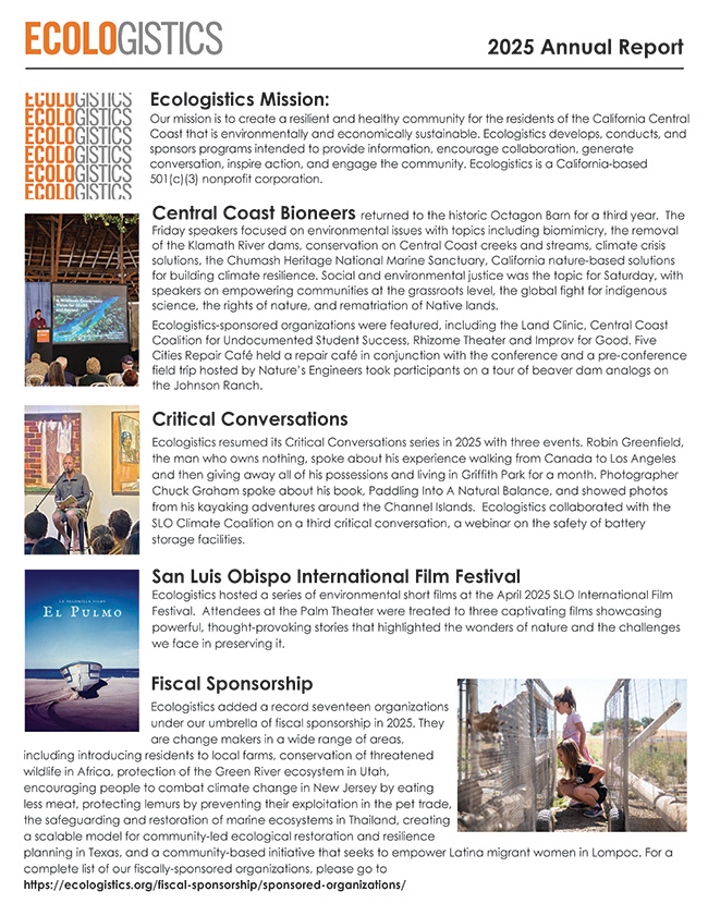 Michael Jencks and Stacey Hunt of Ecologistics® were guests on the local podcast SLO Good Life with James Davis. Listen in on how our local environmental nonprofit got started and its plans for the future.